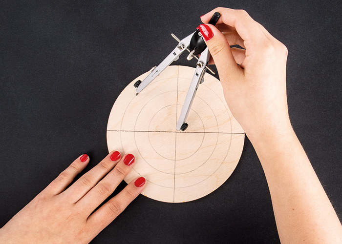 Draw a horizontal and a vertical line with a pencil and a ruler in the middle of the wooden board. Use the compass to draw 3 circles from the centre in the following diameters: 6 cm ø, 9 cm ø, 12 cm ø2 ![]()