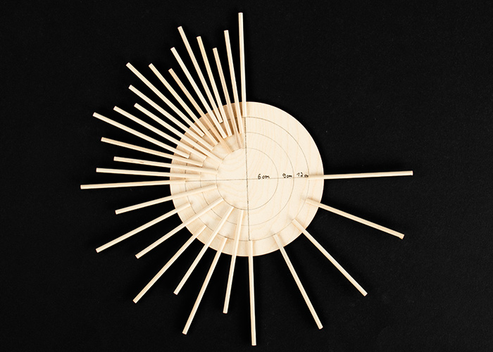 Start with gluing the wooden sticks at the largest circle, then at the smallest one and finally at the middle circle. Allow them to dry well out.4 ![]()