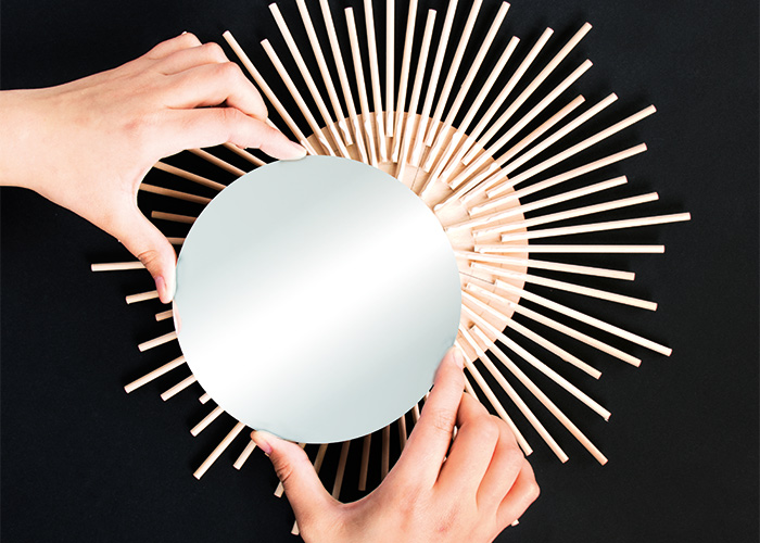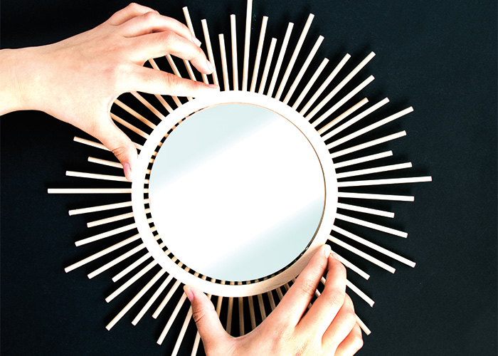 Instructions in 7 steps Make a sunburst mirror out of wooden round board and skewers.