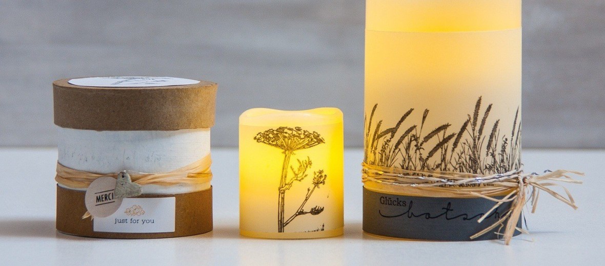 There are many techniques for the creation of your Daily Candle. With transfer medium or foils, you can apply, easily and quickly, your favourite motifs. With stencils, wax liners, stamps and wax sheets can be easily achieved further creative effects. And when time is of the essence, by means of our wax melts the colourful light sources are carried out in no time. The latest trend: marbling with the marble-paint. Just try it out!