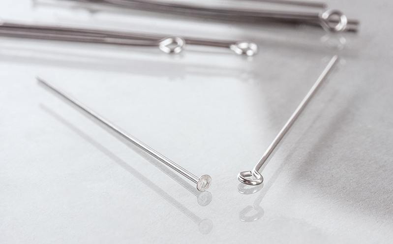 Especially for earrings and other hanging jewellery pieces, our prism and loop pins are important accessories. Once threaded on, the eyelets prevent the beads from slipping through. When all the beads are lined up, you can easily attach the open end to the eyelet by means of the pliers.