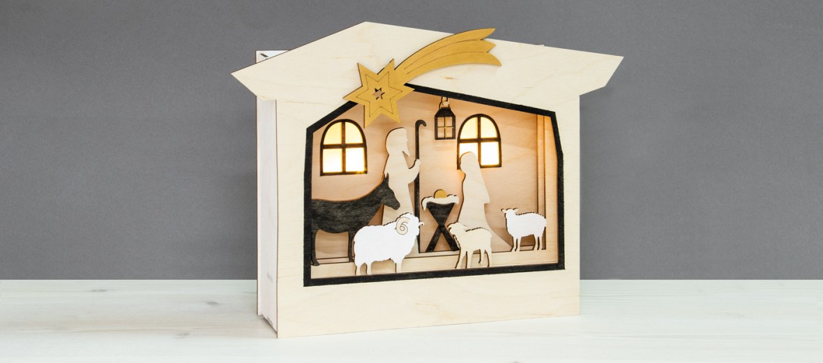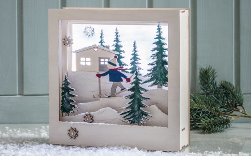 You can choose between practical 3D wood kits that are easy to assemble or you can assemble your favourite scene by yourself out of different building components. You can let your imagination run wild when designing the box. It is your story, your box! In combination with materials derived from nature or floriculture, unique worlds of nature and light emerge, which within your four walls become small oases of peace at a glance telling stories about forests and meadows. A Hygge decor is included! Set highlights with effect-foils and LED fairy lights! Detailed decorative elements and writings transform your individually designed lightbox into an eye-catcher par excellence. You want just that a little more? Glittering decorations will certainly amaze your guests.